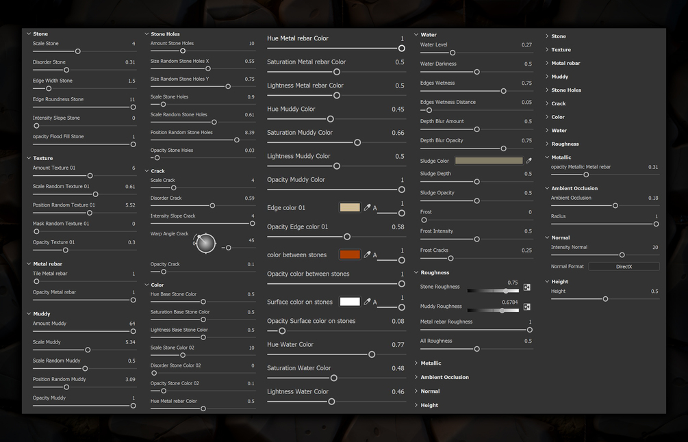 Contains SBS and SBSAR files with the ability to change all kinds of material parameters in the substance painter software (contains a photo of the parameters that can be changed)